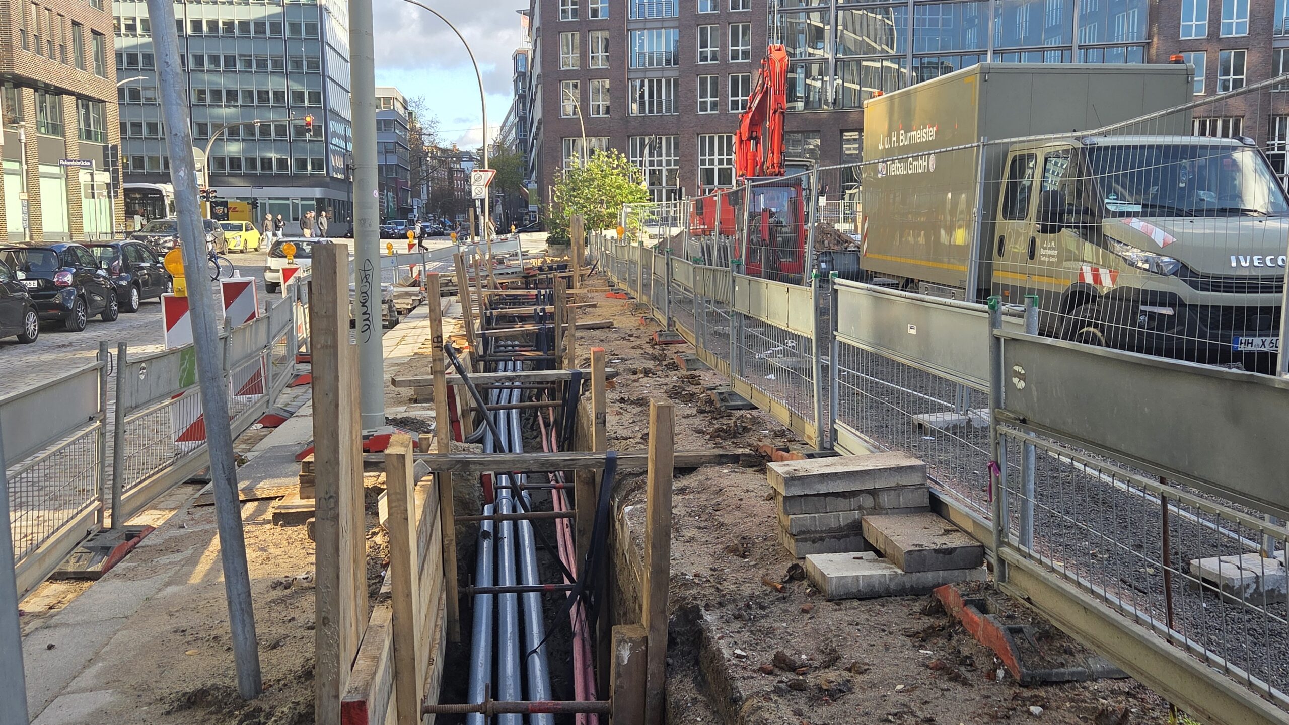 Das Bauprojekt NIK im Hamburger Nikolaiquartier entwickelt sich planmäßig weiter. Aktuell läuft die Ausführungsplanung, sodass die Übergabe des Baufelds an den Spezialtiefbau noch im Dezember 2025 erfolgen kann. Erste Leitungsumverlegungen werden bereits umgesetzt und bereiten das Gelände auf die kommenden Bauphasen vor.